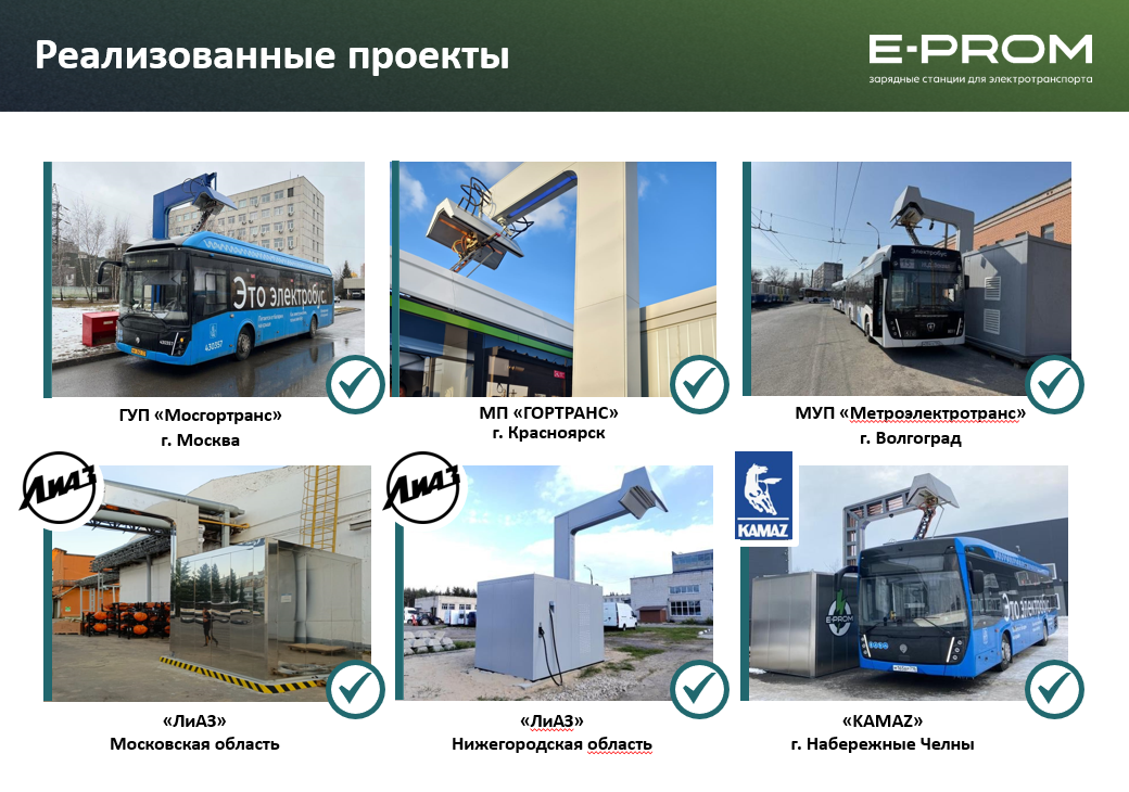 Ультрабыстрая зарядная станция для электробусов E-PROM - это решение для быстрой и стабильной зарядки электрического общественного транспорта. Подходит для депо, конечных остановок и транспортной инфраструктуры. Обеспечивает высокую скорость зарядки, надёжную работу и интеграцию в городские и корпоративные энергосистемы.